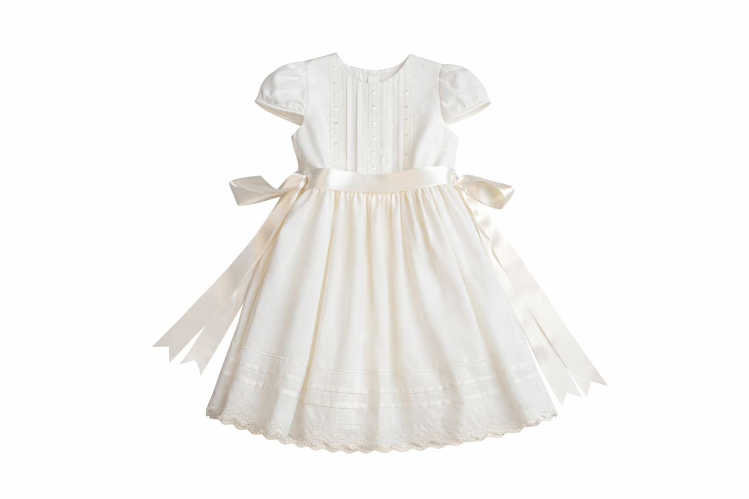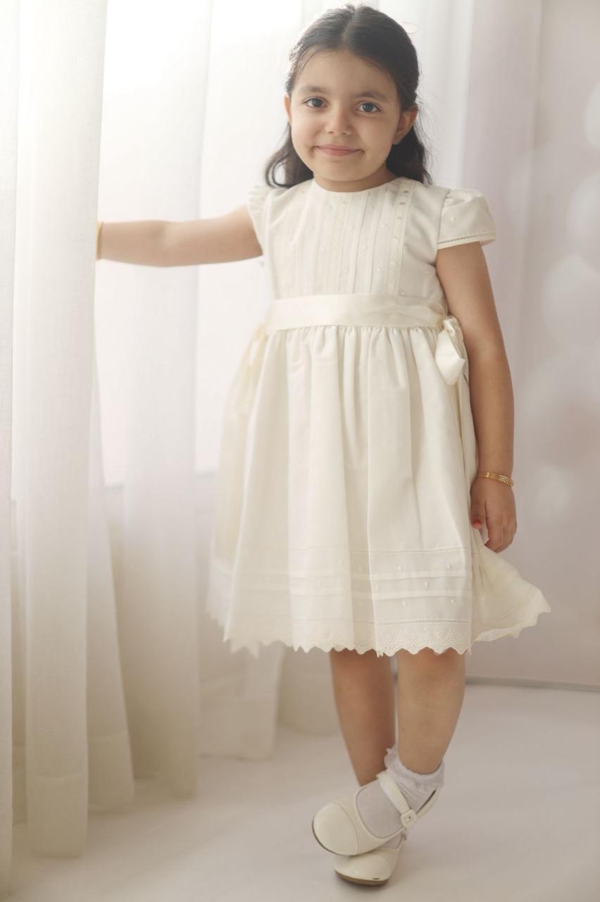 فستان "نورا" يعكس الأناقة السعودية الخالدة. مصمم بلون العاج الناعم، ويتميز بتفاصيل دقيقة في الجزء الأمامي، وأكمام قصيرة أنيقة، وتنورة واسعة مزينة بتشطيبات من الدانتيل الرقيق. أشرطة خصر ساتان تضيف لمسة من الرقي والفخامة.