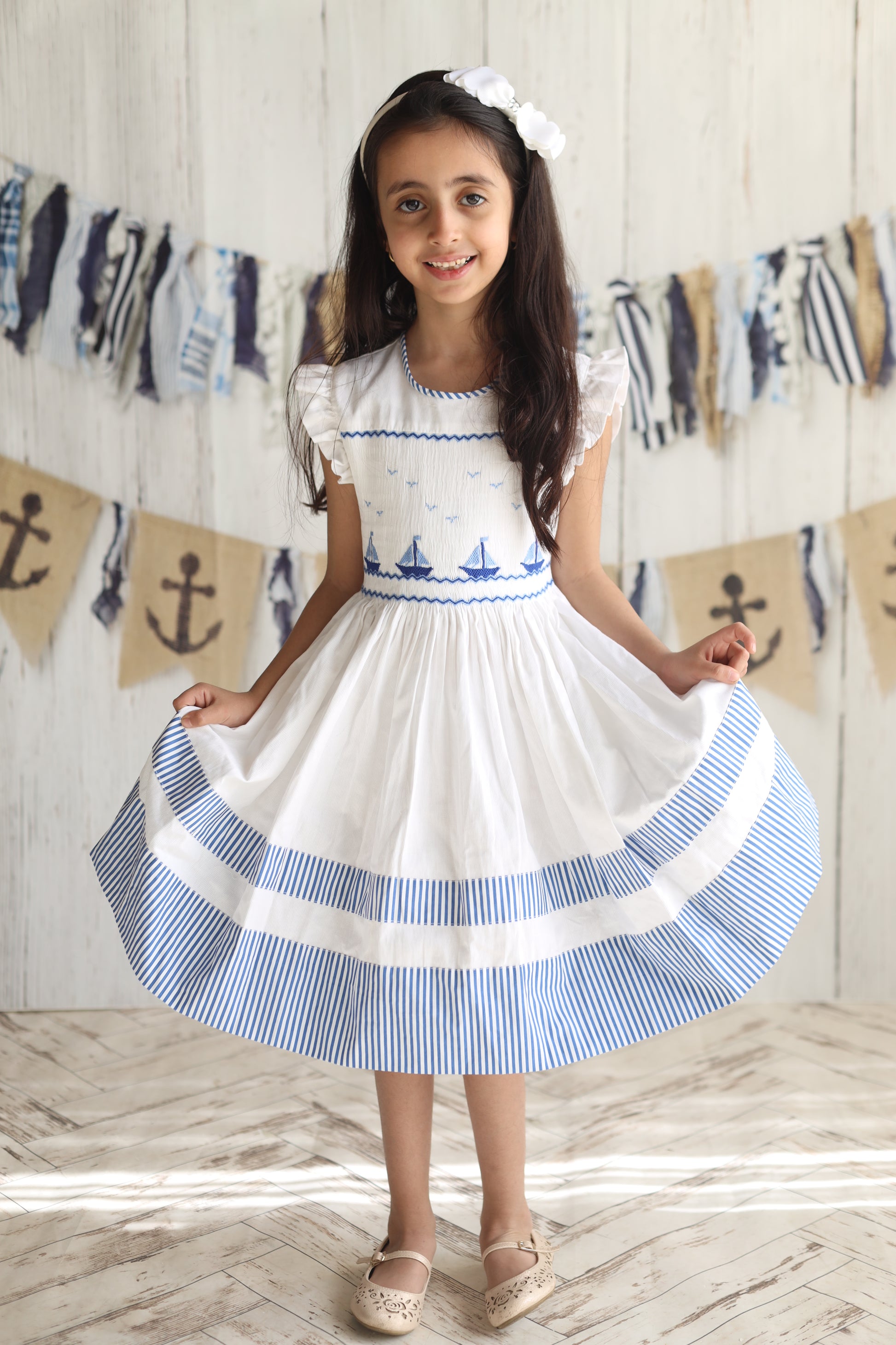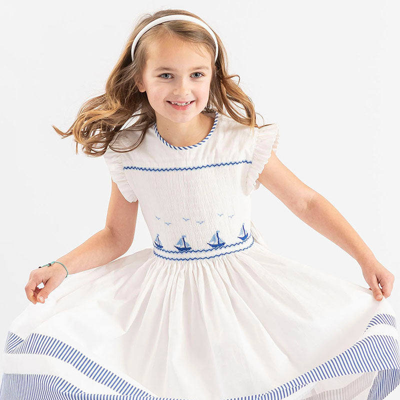 فستان اليخاندرا بسيط وأنيق للغاية. مثالي لأي مناسبة، سواءً كانت وجبة خفيفة، أو سهرة، أو مناسبة خاصة. لونه الأبيض وتفاصيله البحرية تجعله تحفة فنية من مجموعتنا.