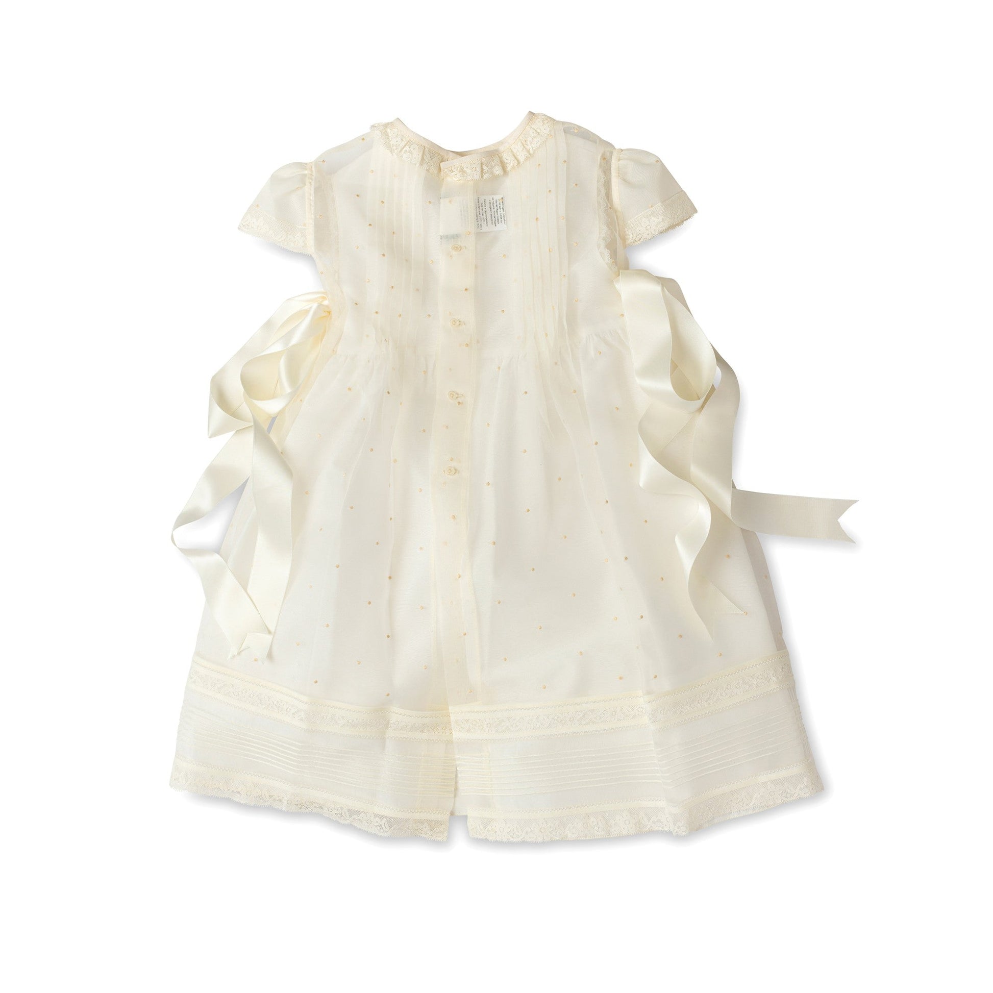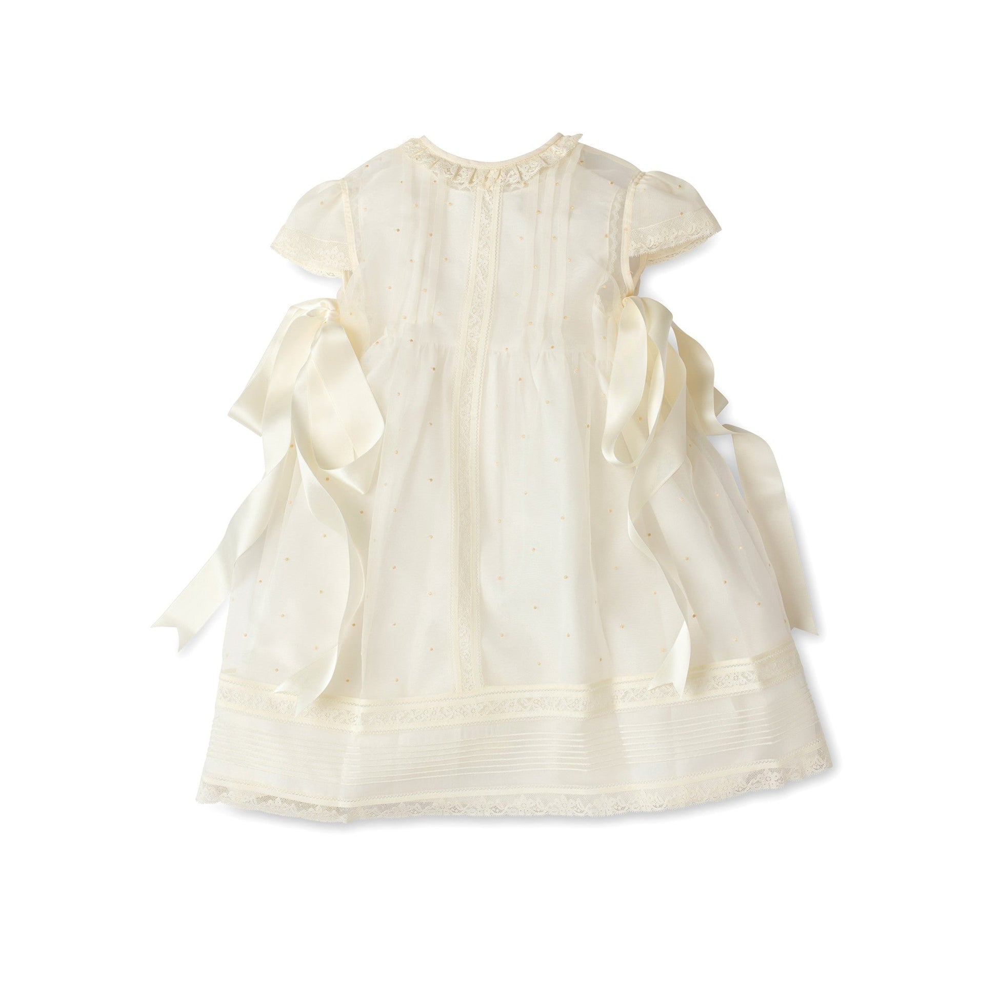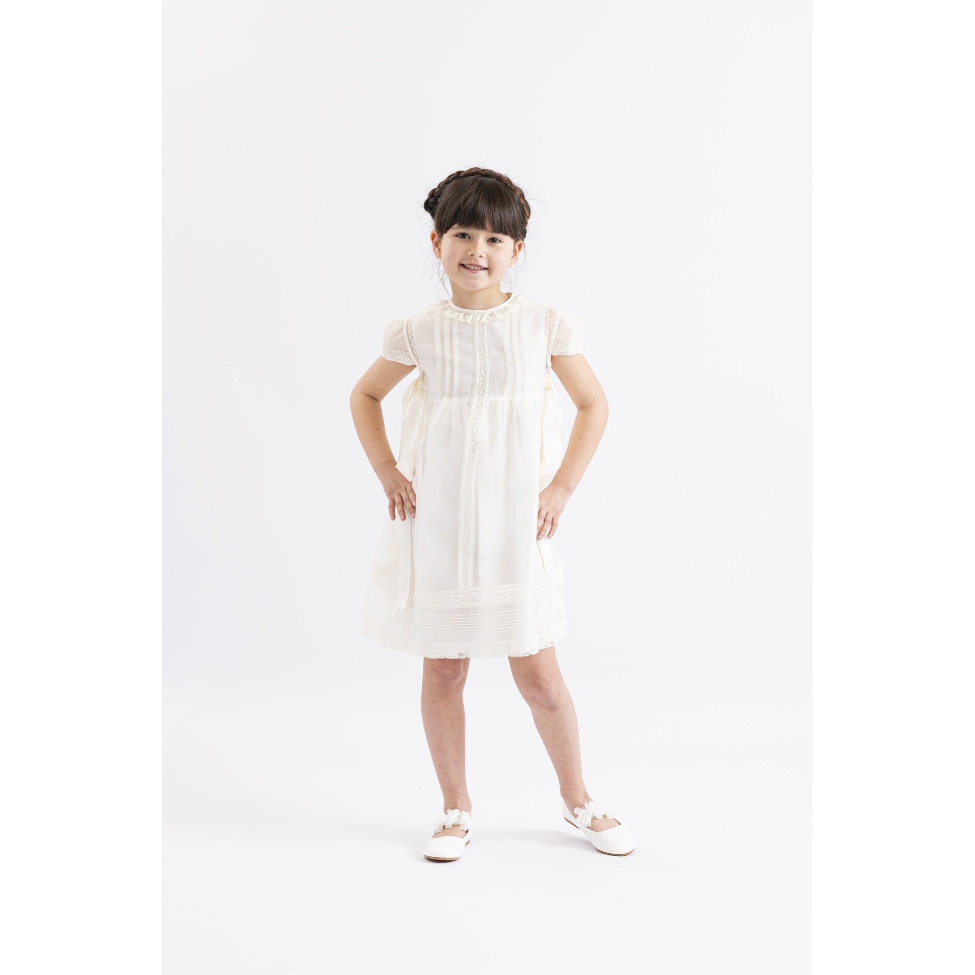 فستان بيج جميل من قماش بلوميتيس مزين بالدانتيل على الياقة وأكمام صغيرة وفي الأمام وأقواس من الساتان على الجانبين.