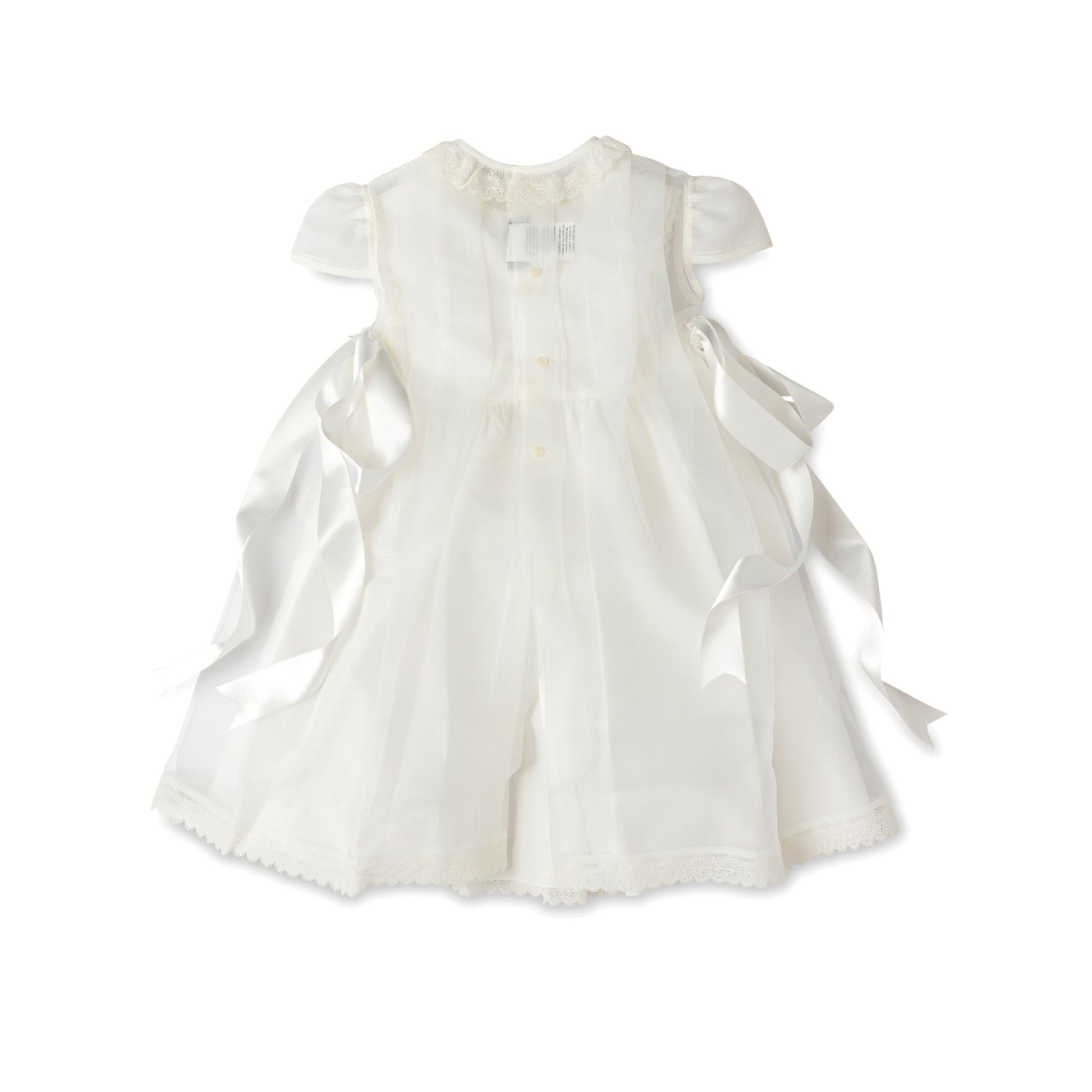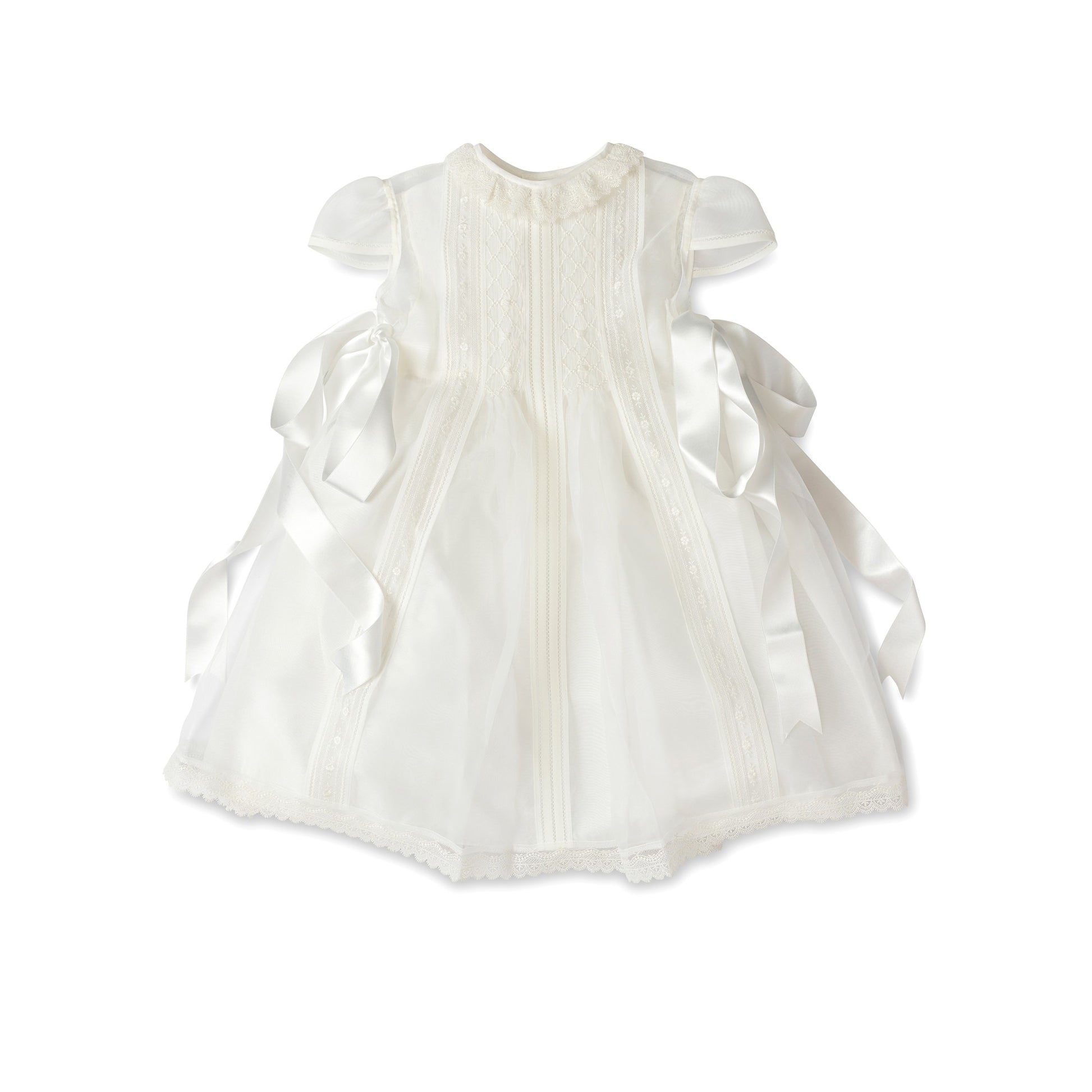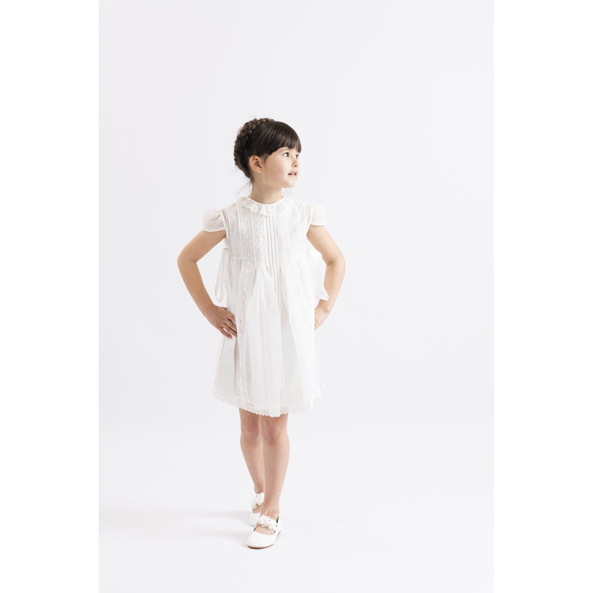 فستانٌ أنيقٌ من الدانتيل المُطرّز بأكمامٍ صغيرة، وعقدة ساتان جانبية، وياقة دانتيل.
