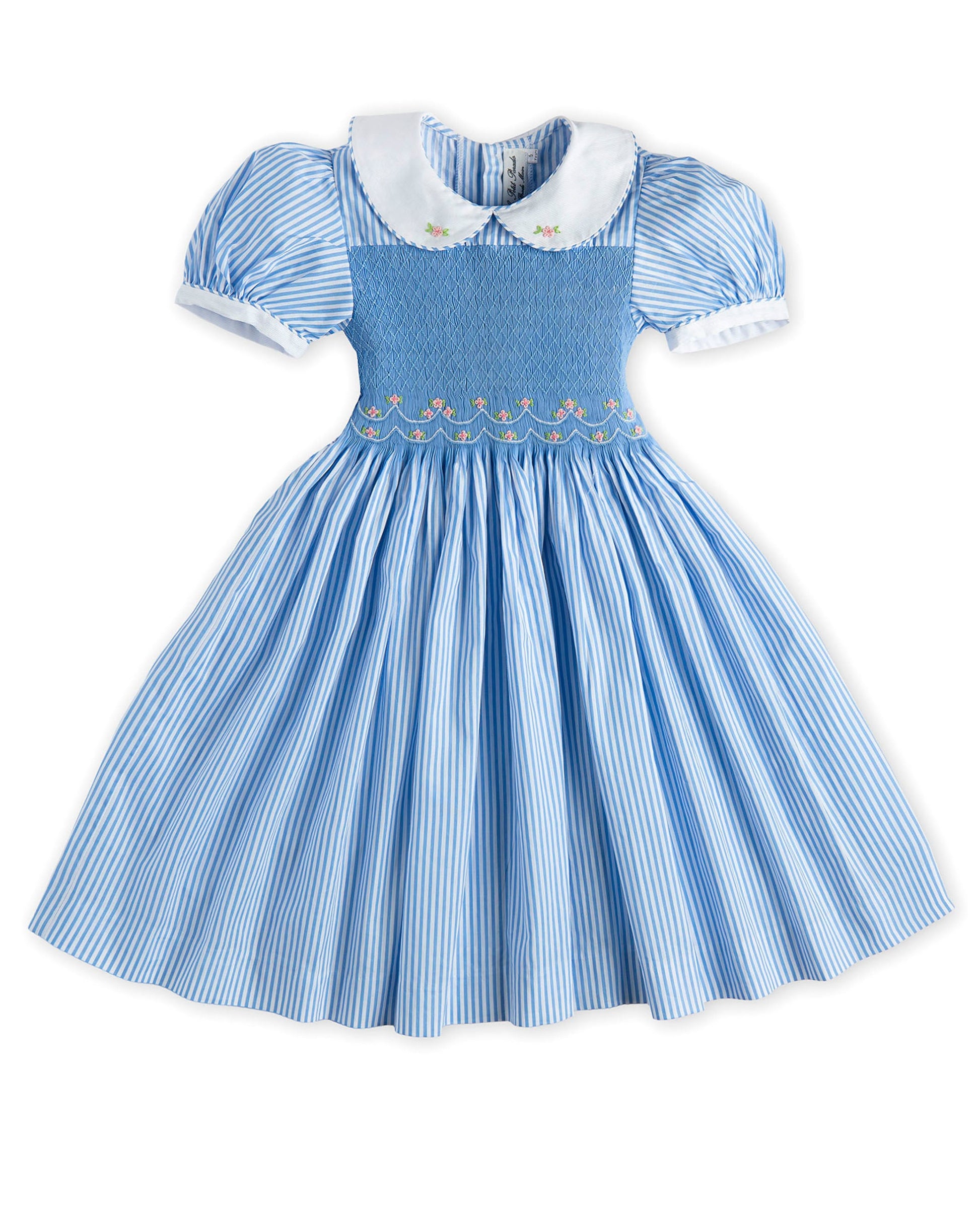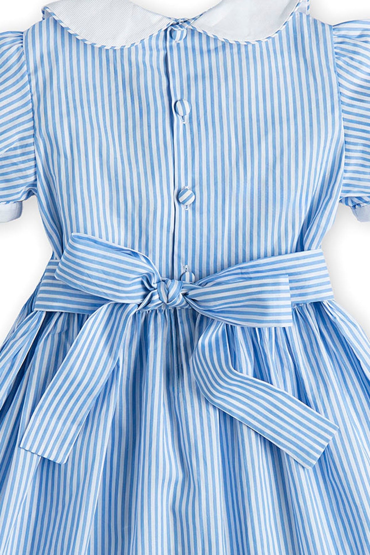 كلاريسا فستان مصنوع يدويًا من القطن الناعم بخطوط زرقاء سماوية وبيضاء رقيقة. يتميز بياقة مستديرة، وعقدة رقيقة من الخلف، وأزرار متناسقة. قصته الانسيابية أنيقة وسهلة الارتداء - قطعة أنيقة وعصرية لكل مناسبة خاصة.