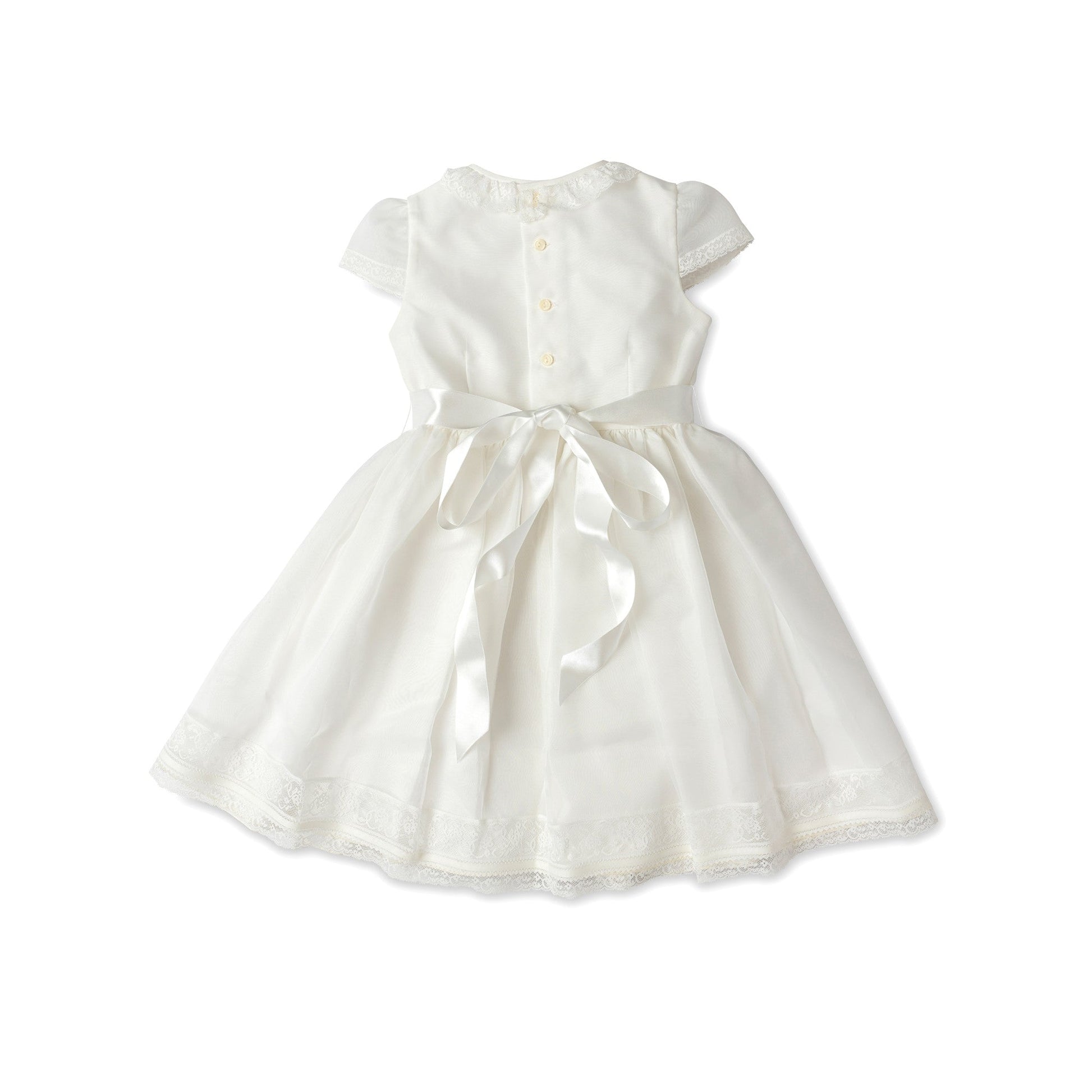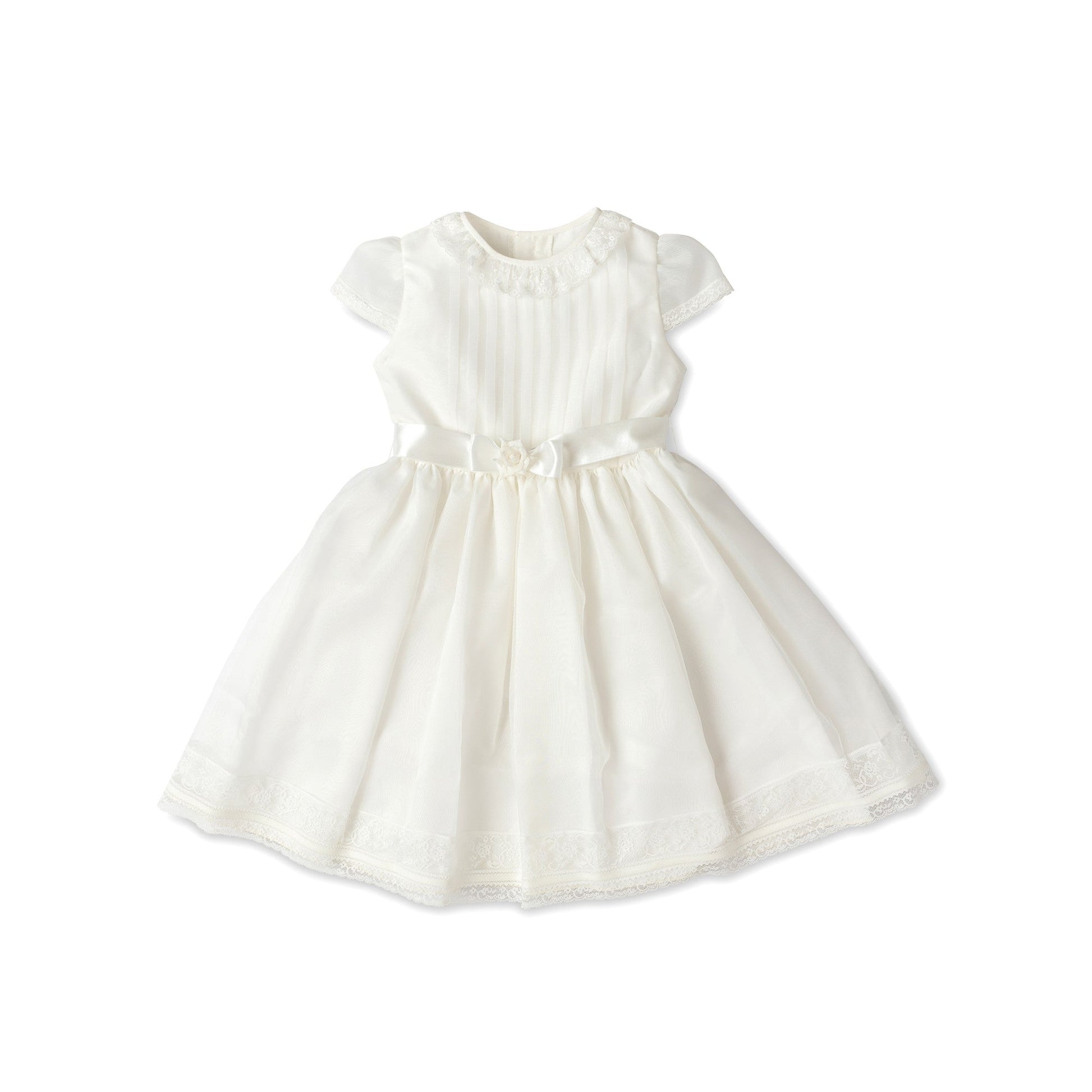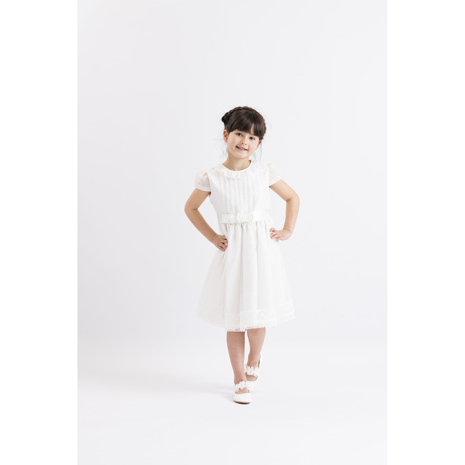 فستان رسمي أبيض ساحر، بياقة وحاشية دانتيل أنيقة. حزام ساتان أنيق مرصع بزهرة بيضاء. أكمام قصيرة مزينة بلمسة دانتيل مميزة